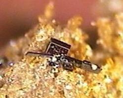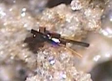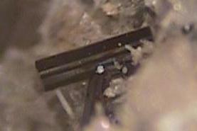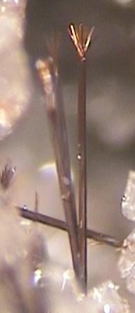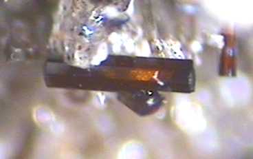 rechts: stabförmiger Kristall Grösse 3mm